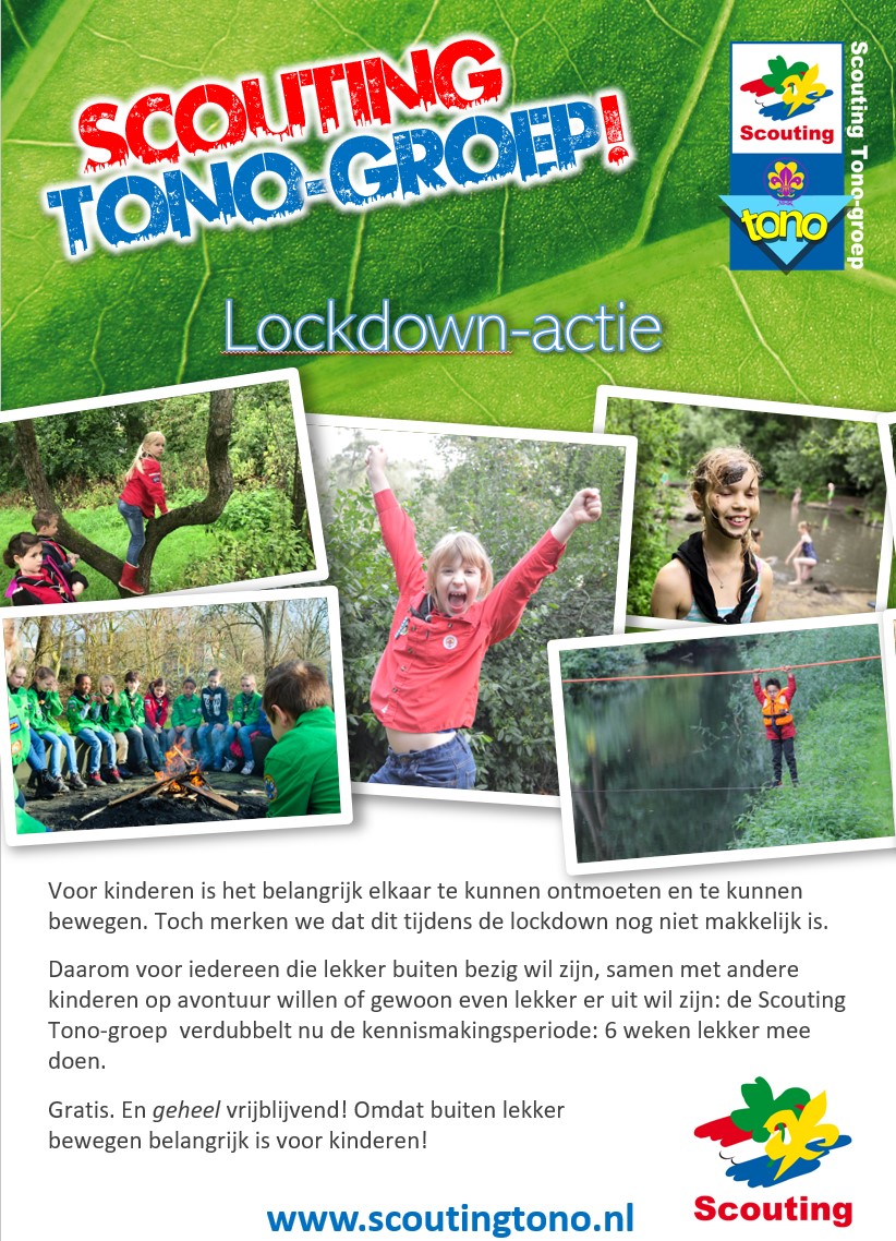 Voor iedereen die lekker buiten bezig wil zijn, samen met andere kinderen op avontuur wil of gewoon even lekker er uit wil zijn: de Scouting Tono-groep  verdubbelt de kennismakingsperiode: 6 weken lekker mee doen. Gratis. En geheel vrijblijvend! Omdat buiten lekker bewegen belangrijk is voor kinderen!