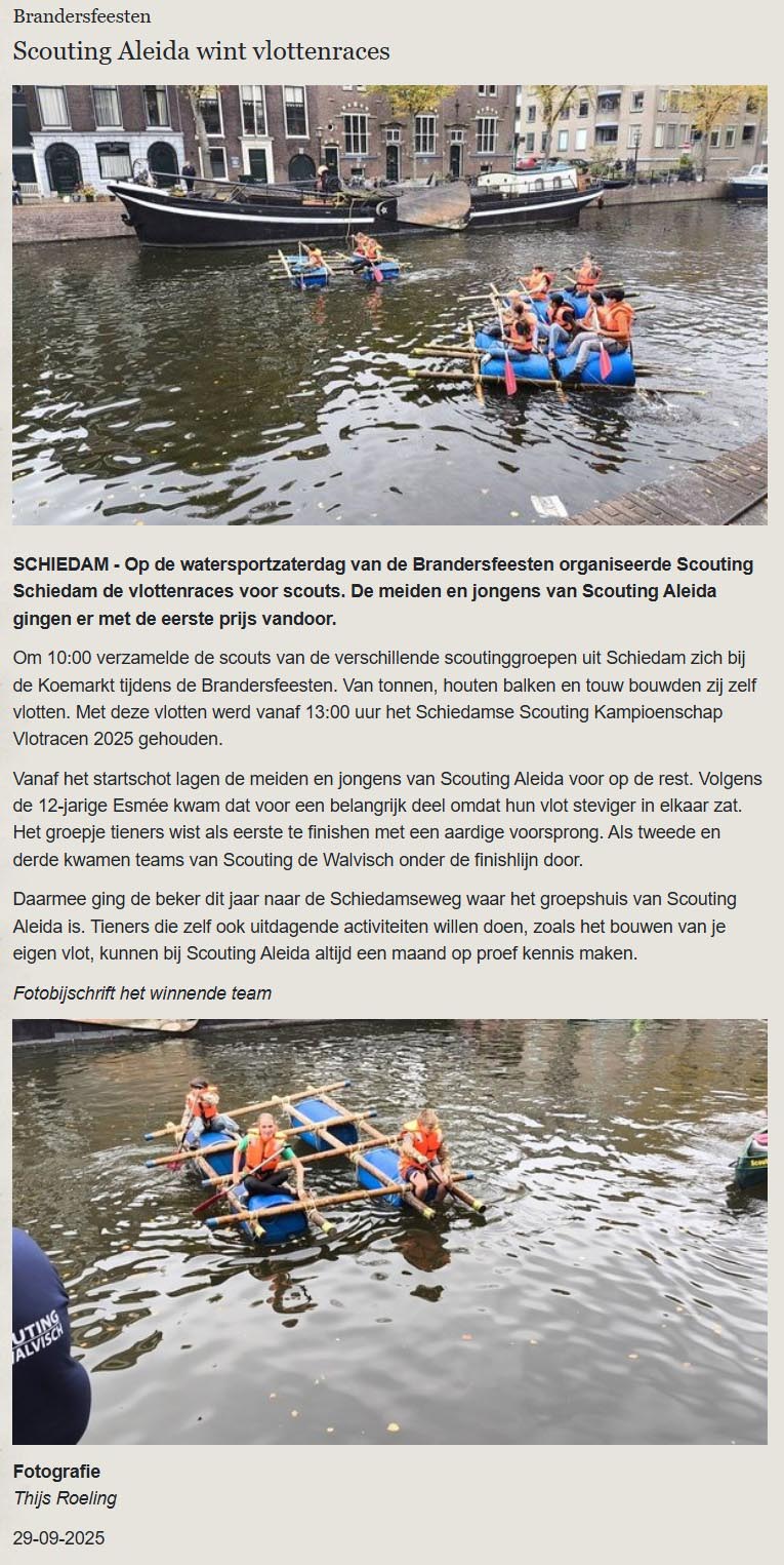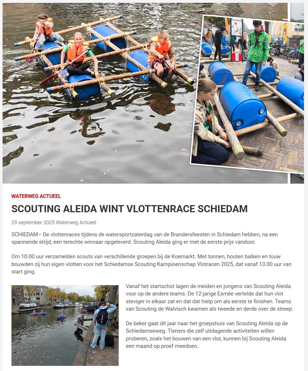 Nieuwssite De Schiedammer Online plaatste ook een bericht over de winst van het vlottenteam van de scouts van Scouting Aleida