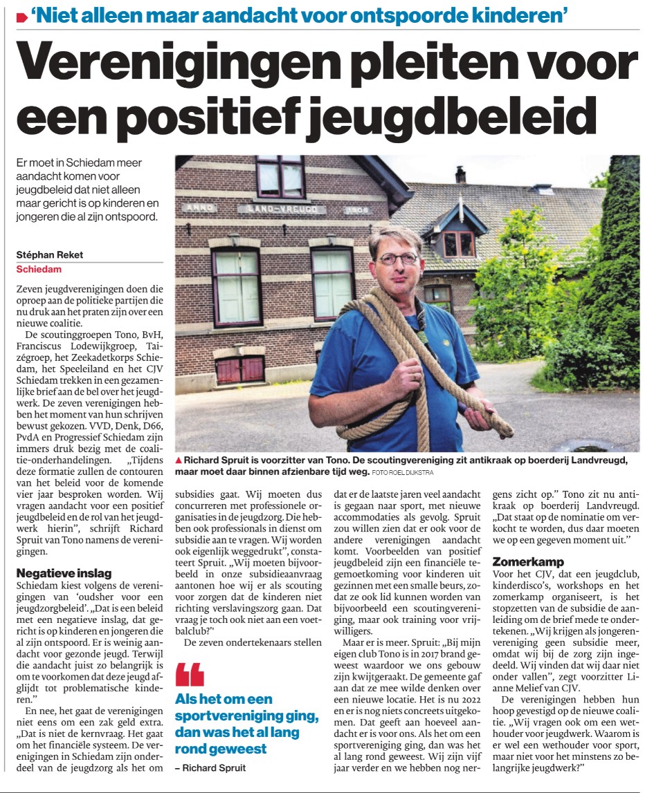 De Scouting Tono-groep en de Scouting Taizé-groep hebben de intentie uitgesproken om tot fusie te komen. Hiervoor is wel goede, geschikte speelruimte nodig. In het Algemeen Dagblad van 16 april 2024 legt Richard Spruit uit wat er voor de beide scoutinggroepen nodig is.