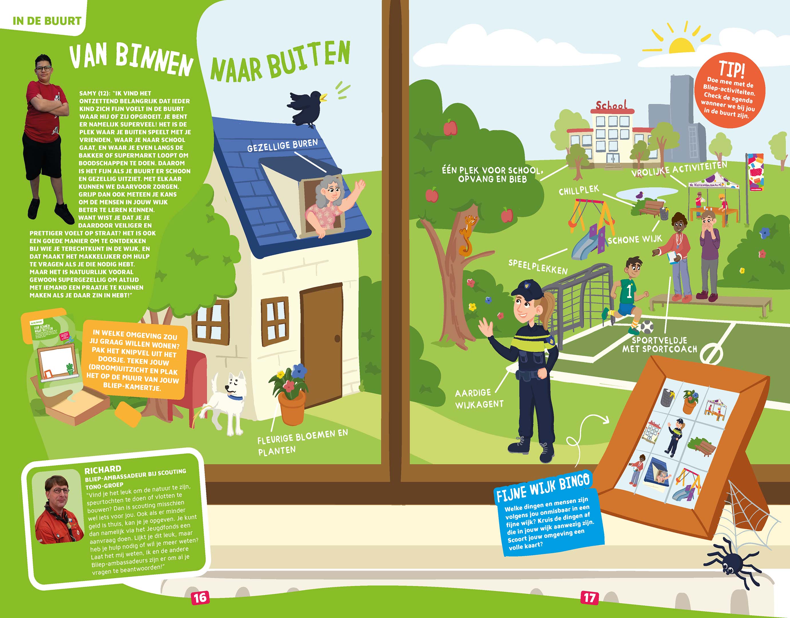 Het eerst wat we van Scouting tegenkomen is onze eigen Scouting Tono-groep Bliep Ambassadeur op pagina 16, als het onderwerp van het doeboek is "lekker naar buiten".