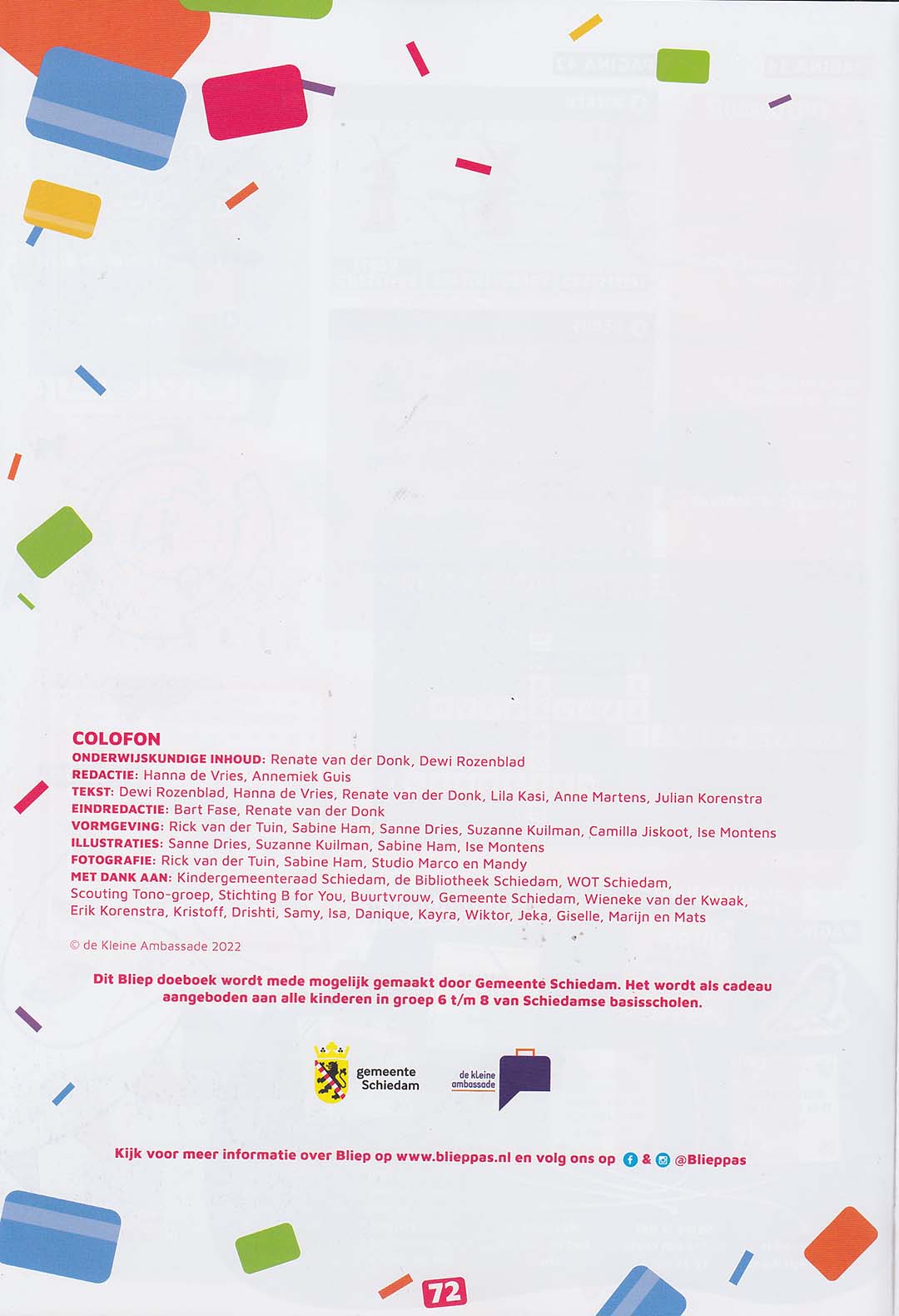 De Kleine Ambassade is een organisatie die zich specialiseert in jeugdparticipatie. Voor alle leerlingen van (jawel) álle basisscholen in Schiedam maakten zij het Bliep Doeboek. Een boek met activiteiten voor de zomervakantie, en als thema Bliep, het initiatief dat alle kinderen mee laat doen.
