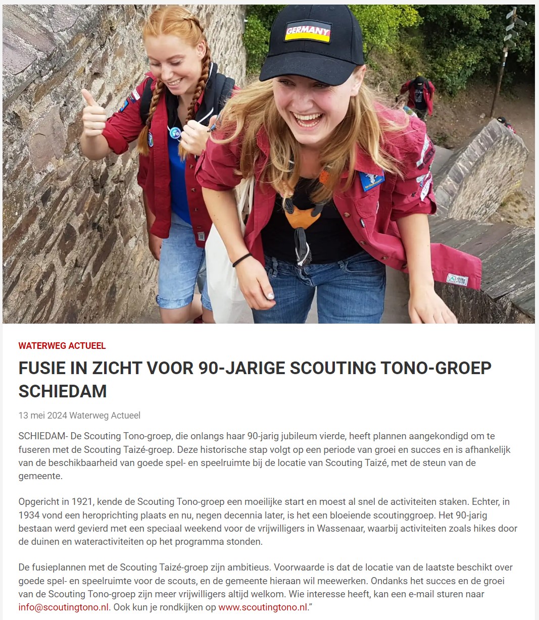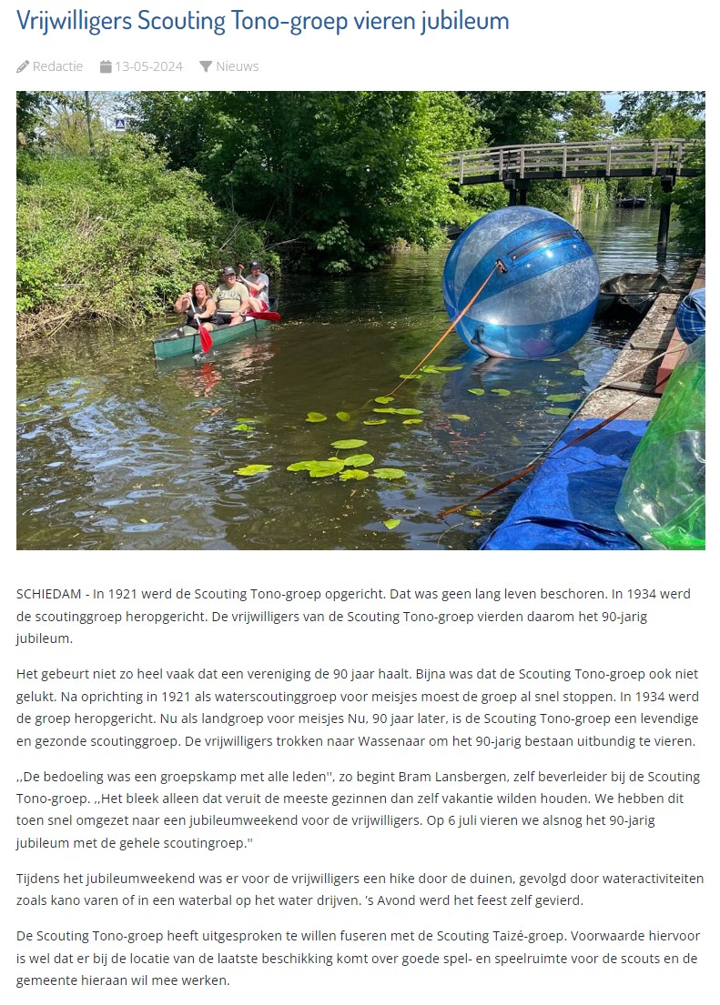 De Schiedammer Online publiceerde op 13 mei 2024 een artikel over het jubileumweekend van de Scouting Tono-groep Schiedam